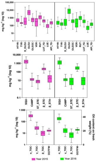 However, there is little knowledge on the content of secondary metabolites in the fruit, and even less on the differences among varieties. Chromatography techniques have revealed a high correlation between the compositions of olive fruit and olive oil in terms of fatty acids [42,53], phenols, tocopherols, sterols, and squalene [8,44].