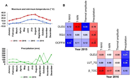 The maximum and minimum average monthly temperature, as well as precipitation, are shown in Figure 4A. Temperature data did not have significant differences between the studied years, while rainfall was 987.80 mm in 2015 and dropped to 746.40 mm in 2016. The correlations between climate data and all 19 traits were measured to individuate the most effective climate factor on trait variation (Figure 4B). In general, the r value was lower than 0.4 for all analyzed traits, and only a few compounds had significant positive or negative correlations with climate factors. In the first year of the study, OLEU had a negative correlation with minimum temperature and a positive correlation with the thermal amplitude; the same phenol had a positive correlation with precipitation in the second year. OCFFW had a positive correlation with maximum temperature in 2015 and was not correlated to this climate factor in 2016. The other phenol, LUT-7G, had a positive correlation with precipitation in 2016, the same as OLEU (Figure 4B).