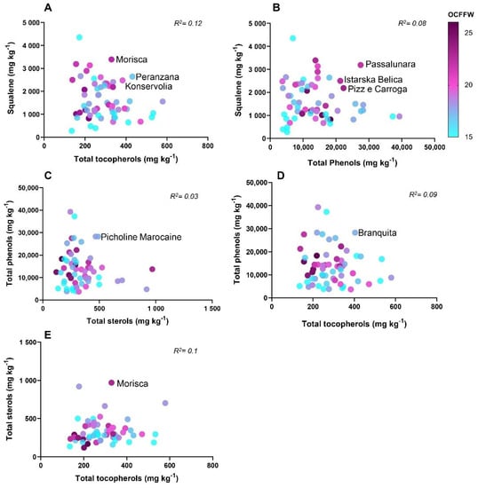 The main traits, total phenols, squalene, total sterols, total tocopherols, and OCFFW, were used to study the relationships among them and to identify promising genotypes regarding these traits. The multiple regression analysis for all combinations of traits, in general, showed a low value of R2, which evidenced the scarcity of cultivars with high values of combined traits, highlighting the need to obtain them through breeding. The multiple regression of squalene, total tocopherols, and OCFFW showed a low value of R2 = 0.12 for all 61 cultivars. The cultivars with the highest values for these three traits were Morisca, Peranzana, and Konservolia (Figure 5A). The squalene, total phenol, and OCFFW combination had R2 = 0.08, and the cultivars with the highest values for this combination were Passalunara, Istarska Belica, and Pizz’e Carroga (Figure 5B). The most valuable cultivar for the combination of total phenols, total sterols, and OCFFW was Picholine Marocaine (R2 = 0.03) (Figure 5C). The total phenol, total tocopherol, and OCFFW combination had R2 = 0.09, and the most valuable cultivar for this combination was Branquita (Figure 5D). Finally, the cultivar Morisca demonstrated the highest value for the combination of total sterols, total tocopherols, and OCFFW, with R2 = 0.1 (Figure 5E).