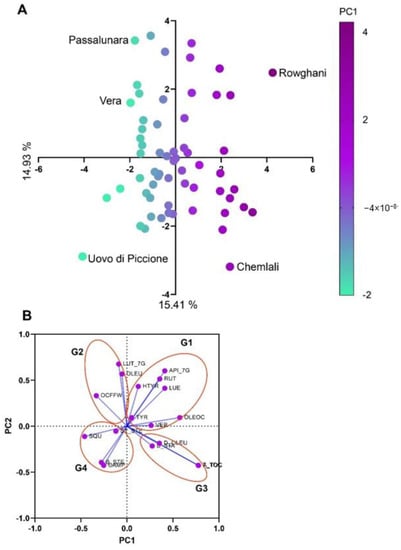 Principal component analysis (PCA) was performed to cluster the 61 studied cultivars in two crop seasons for 19 analyzed traits (Figure 6A). The loading plot showed that the cultivars plotted in the group 1 (G1) area had the highest content of seven phenolic compounds out of eleven and low content of all other studied traits. Within this group, cv. Rowghani had the highest content for the seven analyzed phenols and the lowest content of sterols. The cultivars included in the second group (G2) had high content of OLEU and LUT_7G and high OCFFW. The G3 cultivars had high content of tocopherols, D_OLEU, and β_STA, and among them, cv. Chemlali had the highest quantity of all of these compounds. The G4 cultivars had high content of squalene and sterols, low content of phenols and tocopherols, and low oil content in fresh fruit. Cv. Uovo di Piccione had the highest quantity of squalene and sterols (Figure 6B).