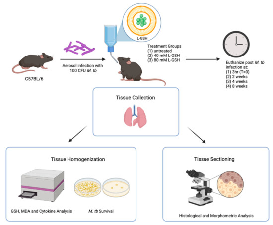 Schema of the study design. The C57BL/6 mice were infected with 100 CFU H37Rv M. tb strain. The mice were treated with either 40 mM L-GSH, 80 mM L-GSH, or untreated before euthanizing at 3 h (T = 0), 2-, 4-, and 8-weeks post-infection. The lungs were collected and either homogenized or sectioned for GSH, MDA, and cytokine analysis, or histological and morphometric analysis, respectively. The sample size (n) includes 4 mice in the 3 h group and 6 mice, each for the 2, 4, and 8 weeks groups. The figure was created using biorender.com.