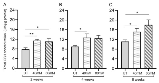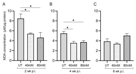L-GSH treatment significantly reduced the malondialdehyde (MDA) levels in the lungs of M. tb-infected mice at 2 weeks and 4 weeks post-infection. The MDA levels in the lung lysates of untreated (UT) or 40 mM or 80 mM L-GSH-treated M. tb-infected mice were measured spectrophotometrically. The lung lysates were collected from the untreated mice and mice treated with 40 mM or 80 mM L-GSH at 2 weeks (A), 4 weeks (B), and 8 weeks (C) post-infection (p.i.). All of the values plotted for each group represent the mean values +/− standard deviation. One-way ANOVA with Tukey’s multiple group post correction was applied to determine the significance between groups, and a p-value of <0.05 (*) was considered significant. Statistical analysis was performed using GraphPad Prism Software 8. The sample size is 6 mice (n = 6) per group, per time point.
