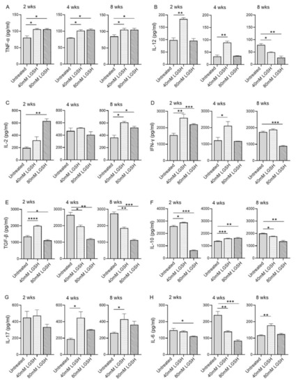 Similar to TGF-β, the level of IL-10 was significantly increased at 2 weeks post-infection in mice treated with 40 mM L-GSH, while the level of IL-10 was significantly reduced in 80 mM L-GSH-treated animals, compared to the untreated group (Figure 4F). However, treatment with either 40 mM or 80 mM significantly increased the level of IL-10 at 4 weeks, before the levels were significantly reduced at 8 weeks post-infection in the L-GSH-treated animals, compared to the untreated controls.