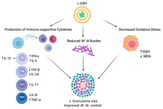 Summary of the results. Treatment of L-GSH was associated with decreased oxidative stress, the induction of a Th1 cytokine response, and reduced M. tb burden in infected mice organs. L-GSH treatment increased the GSH levels and decreased the levels of lipid peroxidation by-product, MDA, resulting from decreased oxidative stress. An increase in IFN-γ, TNF-α, IL-2, IL-12, and IL-17 levels was also noted after L-GSH treatment, while IL-10, TGF-β, and IL-6 levels were decreased in this group. A significant decrease in M. tb CFUs was observed in the lungs after L-GSH treatment. An upward arrow (↑) resembles an increase; a downward arrow (↓) resembles a reduction. The figure was created using biorender.com.