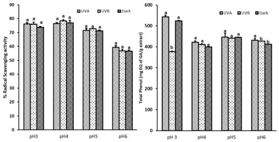As shown in Figure 3, there was no significant difference in the radical scavenging activity of the extract under UVA and UVB conditions, which suggests that UV radiation at the selected intensity did not degrade the activity of the extract, thereby confirming the photostable profile of the studied extract at the different pH conditions.