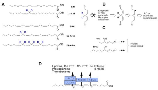 - Navratil, A.R.; Shchepinov, M.S.; Dennis, E.A. Lipidomics Reveals Dramatic Physiological Kinetic Isotope Effects during the Enzymatic Oxygenation of Polyunsaturated Fatty Acids Ex Vivo. J. Am. Chem. Soc. 2017, 140, 235–243. [Google Scholar] [CrossRef]