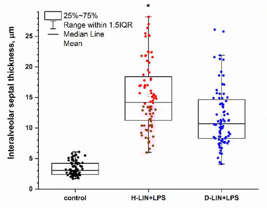 Interalveolar septal thickness (µM) of BALB/c mice after 6 weeks of H- or D-forms of linoleic acid treatment (H-LIN and D2-LIN) followed by single intranasal administration of lipopolysaccharide. *—p ≤ 0.05, compared H-Lin versus D2-Lin mice.