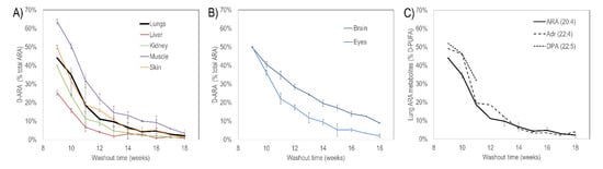 D-ARA as a percentage of all ARA at eight weeks dosing and washout over the subsequent nine weeks with H-ARA feeding. (A) Visceral organs and skin. Lung incorporated about 45% D-ARA. (B) Neural tissue: whole brain and whole eyes. Both incorporated about 50% D-ARA. Washout from eyes was more rapid than from the brain. (C) Lung D-ARA and conversion to longer chain PUFA adrenic acid (22:4(n-6)) by elongation and docosapentaenoic acid (DPA, 22:5(n-3)) by desaturation. All PUFAs followed similar washout kinetics.