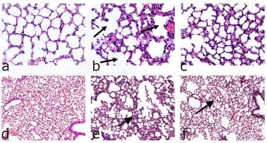 Histological evaluation of the effect of intranasal administration of lipopolysaccharide on the lungs of H-ARA- and D-ARA-treated male mice. Top: increased alveolar septal thickness in LPS-treated mice: (a) Norm; (b) LPS-treated on H-ARA diet; (c) LPS-treated on D-ARA diet. Arrows—emphysematous area. Bottom: lower magnification sections with emphysematous areas in LPS-treated mice: (d) Norm; (e) LPS-treated on H-ARA diet; (f) treated on D-ARA diet. Arrows—increased thickness of alveolar septa in LPS-treated mice. Bar, 100 μM.