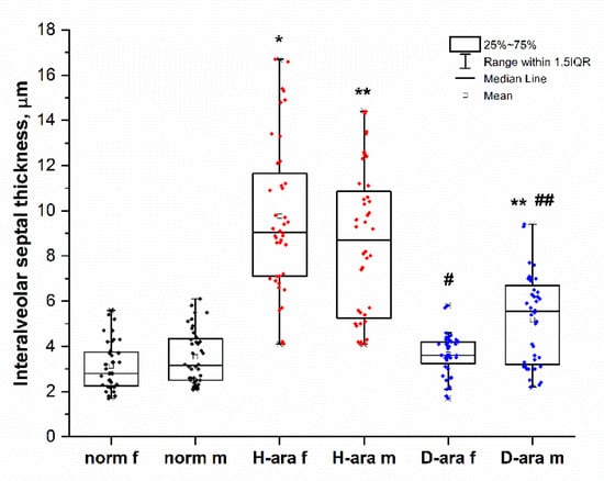 Interalveolar septal thickness (µM) after a 6-week course of H- or D-ARA by single intranasal administration of LPS. Norm, male and female mice without LPS treatment. *—p ≤ 0.05, H-ARA female mice versus control females; **—p ≤ 0.05, H-ARA male mice versus control males; #—p ≤ 0.05, H-ARA female mice versus D-ARA females; ##—p ≤ 0.05, H-ARA male mice versus D-ARA males.