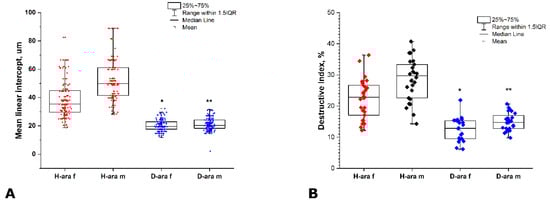 Emphysematous lumen area of female and male mice that consumed H- or D-arachidonic acid for 6 weeks and then received LPS once intranasally at a dose of 1 mg/kg. MLI (A) and DI (B) were measured as described in Materials and Methods (Section 2.4). Data are presented as means ± standard error. *—p ≤ 0.05 D-ARA males versus H-ARA males; **—p ≤ 0.05 D-ARA females versus H-ARA females.