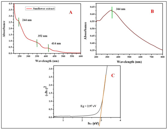 Figure 3A shows the UV-Visible spectrum of the sunflower leaf extract. Three absorption bands can be observed. Band I (λmax 244 nm) and band II (λmax 352 nm), both bands in the UV region, might be attributed to (π→π*) transitions, while Band III (λmax 414 nm) might correspond to (n→π*) transitions. Previous reports [47] showed two absorption bands for the Withania coagulans leaf extract at 200–250 and 300–350 nm. The optical properties of the extract were determined using UV-Visible spectroscopy. Figure 3B displays the characteristic absorption spectrum of ZnO-NPs. Earlier reports [48] showed that the UV-Visible absorption band of ZnO nanoparticles ranges between 300 and 400 nm. The formation of the absorption band of ZnO-NPs was noticed at λmax 344 nm. The absorption coefficient for ZnO-NPs was determined using the following equation: