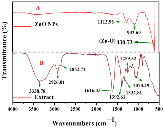 FTIR analysis identified the functional groups in the plant extract and the capping and reducing agent’s major role in the formation of ZnO nanoparticles. Figure 4A,B shows the FTIR spectrum of ZnO nanoparticles and the plant extract; in the plant extract, the peak at 3338 cm−1 corresponds to the (–O–H) hydroxyl group of stretching vibrations. The peaks at 2926 and 2852 cm−1 were attributed to the symmetric and asymmetric –CH stretching vibrations of the methyl group, respectively. A strong peak at 1616 cm−1 represented the carbonyl group (–C=O) stretching vibration. In a similar way, prior reports [50] showed Leucaena leucocephala bark extract to have FTIR bands of 2918 and 2850 cm−1, corresponding to the symmetric and asymmetric methyl and methylene groups’ stretching vibration, respectively. The peak located at 1392 cm−1 it may be assigned to the carbon and oxygen (–C–O) stretching vibration. In the present spectrum, there is a strong absorption band at around 1332 cm−1 which was attributed to carbon and oxygen and carbon (–C–O–C–) stretching vibrations. The peak arising at 1259 cm−1 may be due to carbon and nitrogen (–C–N) stretching vibrations. The peaks below 1000 cm−1 correspond to the bending vibration of polyphenols was represented Figure 4B.