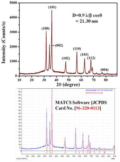 About 0.05 M Zn(O2CCH3)2(H2O)2 solution (30 mL) was dissolved in 30 mL of the plant extract and stirred using a magnetic stirrer at 500 rpm for 3 h at 80 °C. The colorless fluid of the zinc acetate solution changed to a yellowish milky white color with the addition of the sunflower leaf extract. After 3 h, a white precipitate developed when colored nanoparticles were formed, which indicated the formation of ZnO nanoparticles. The solution was then carefully transferred and centrifuged for 30 min at 3500 rpm. The resulting pellet was then washed twice with absolute alcohol and evaporated, followed by double-distilled water cleaning to remove any biomolecules and impurities, and was then centrifuged again under the same conditions The pure, fine pellets were collected and dried in a hot-air oven, then crushed into powder for further analysis. The synthesized sample was then subjected to calcination in a muffle furnace, annealing at 500 °C for 3 h. The crystalline nature of the pure ZnO nanoparticles is shown in Figure 2.