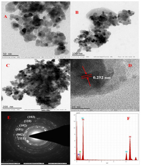 TEM images showing the ZnO-NPs at different magnifications: (A) (50 nm), (B) (100 nm), (C) (200 nm); (D) represents the d-spacing, (E) denotes the SEAD pattern of polycrystalline, (F) rep-resents the EDAX analysis of the ZnO-NPs.