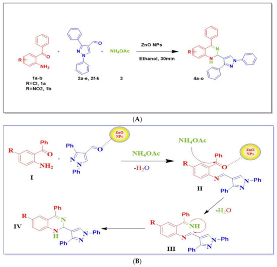 (A) Synthesis of 2-(1,3-diphenyl-1H-pyrazol-4-yl)-4-phenyl-1,2-dihydroquinazoline derivatives. (B) A plausible mechanism for the synthesis of 1,2-dihydroquinazolines by ZnO nanoparticles.