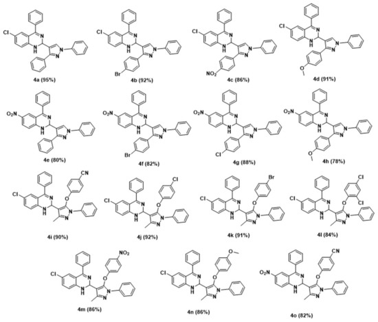 Thus, under optimized conditions, an overview of the reaction was investigated by employing several pyrazole 4-carbaldehydes, 2a–e, and 2f–k. The obtained results are depicted in Figure 9.