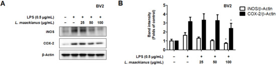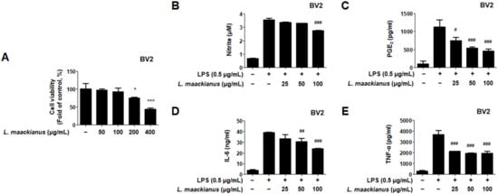 3.3. Effects of L. maackianus Extract on Levels of Pro-Inflammatory Mediators and Cytokines in LPS-Induced BV2 Cells