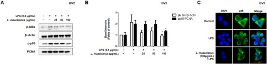 3.4. Effects of L. maackianus Extract on NF-κB Activation in LPS-Induced BV2 Cells