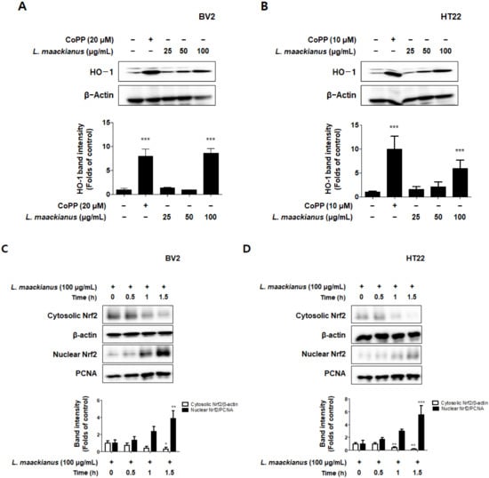 3.6. Effects of L. maackianus Extract on HO-1 Expression and Nrf2 Nuclear Translocation