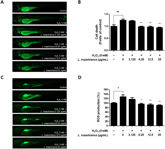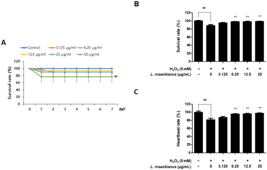 3.7. Antioxidant Effect of L. maackianus Extract in Zebrafish Stimulated with H2O2