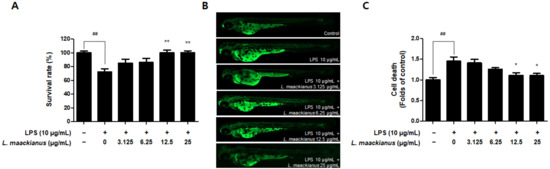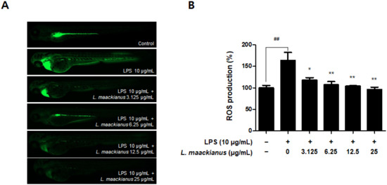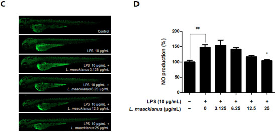 3.8. Anti-Inflammatory Effect of L. maackianus Extract in Zebrafish Model Stimulated with LPS