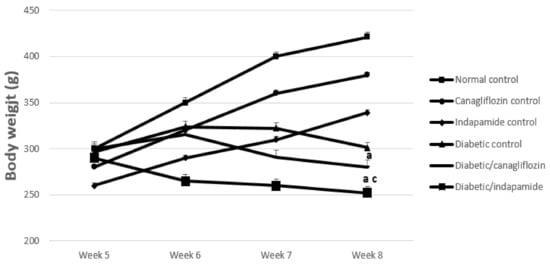 Impact of daily CANA and INDA treatment on B.W.: oral CANA and INDA treatments were initiated once daily for 4 weeks. Data represent the mean ± S.E.M. (6 rats/group). ANOVA followed by post hoc Tukey–Kramer test at (p < 0.05) was used for statistical comparison; a against normal CTRL, c against initial B.W.