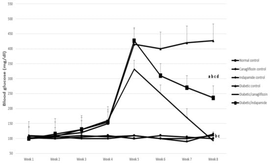 Impact of daily CANA and INDA treatment on blood glucose: oral CANA and INDA treatments were initiated once daily for 4 weeks. Data represent the mean ± S.E.M. (6 rats/group). ANOVA followed by post hoc Tukey–Kramer test at (p < 0.05) was used for statistical comparison; a against normal CTRL, b against diabetic CTRL, c against initial blood glucose, d against diabetic/CANA.