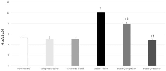 Impact of daily oral CANA and INDA treatment on HbA1c%: oral CANA and INDA treatments were initiated once daily for 4 weeks. Data represent the mean ± S.E.M. (6 rats/group). ANOVA followed by post hoc Tukey–Kramer test at (p < 0.05) was used for statistical comparison; a against normal CTRL, b against diabetic CTRL, d against diabetic/CANA.