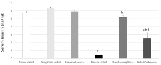 In context, there was a significant reduction of approximately 93% in serum insulin in the diabetic CTRL group (p < 0.05) compared to normal CTRL. Oral CANA (10 mg/kg) and INDA (10 mg/kg) treatment for 4 weeks significantly improved serum insulin levels, which exhibited a significant increase of approximately 13- (p < 0.05) and 6.3-fold (p < 0.05), respectively, compared to diabetic CTRL. CANA (10 mg/kg) was found to have a superior effect in terms of enhancing serum insulin levels (Figure 4), as it almost restored serum insulin levels to normal, on the basis of a comparison with the normal CTRL.
