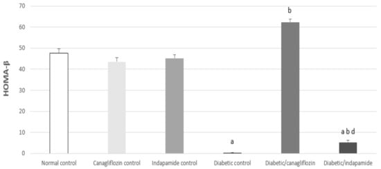 Impact of daily CANA and INDA treatment on HOMA-β: oral CANA and INDA treatments were initiated once daily for 4 weeks. Data represent the mean ± S.E.M. (6 rats/group). ANOVA followed by post hoc Tukey–Kramer test at (p < 0.05) was used for statistical comparison; a against normal CTRL, b against diabetic CTRL, d against diabetic/CANA.