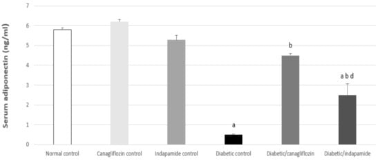CANA increased serum adiponectin levels, which is in line with the results of Garvey et al., 2018 [37]. Even though various studies have reported INDA to lower serum adiponectin levels [38,39], the current results confirm that INDA increases serum adiponectin levels.