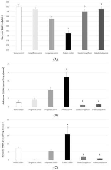 Impact of daily CANA and INDA treatment on serum TAC (A) and MDA content in epididymal adipose tissue (B) and soleus muscle (C) oral CANA and INDA treatments were initiated once daily for 4 weeks. Data represent the mean ± S.E.M. (6 rats/group). ANOVA followed by post hoc Tukey–Kramer test at (p < 0.05) was used for statistical comparison; a against normal CTRL, b against diabetic CTRL.
