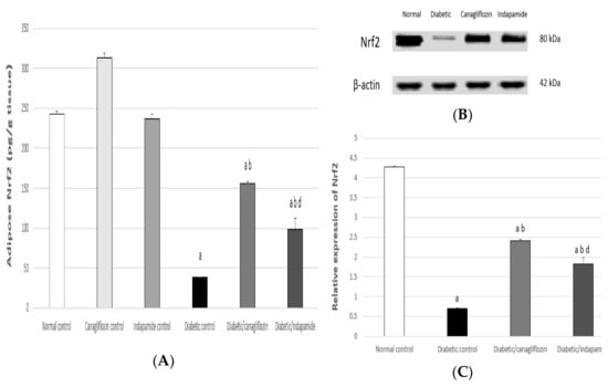 Nrf2 is a transcription factor that regulates the cellular antioxidant response by enhancing the expression of endogenous antioxidant and cytoprotective enzymes [49]. Adiponectin has been reported to ameliorate cardiac hypertrophy by preserving myocardial Nrf2 expression [50]. Moreover, Hasan et al., 2020 [46] and Schragenheim et al., 2018 [51] confirmed CANA and INDA to enhance Nrf2 expression in epididymal adipose tissue, with significant decreases in oxidative load and lipid peroxidation, and enhancement of the TAC, thus confirming their antioxidant impact.