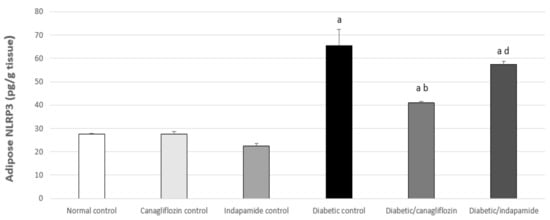 Impact of daily CANA and INDA treatment on epididymal adipose tissue NLRP3 expression: oral CANA and INDA treatments were initiated once daily for 4 weeks. Data represent the mean ± S.E.M. (6 rats/group). ANOVA followed by post hoc Tukey–Kramer test at (p < 0.05) was used for statistical comparison; a against normal CTRL, b against diabetic CTRL, d against diabetic/CANA.