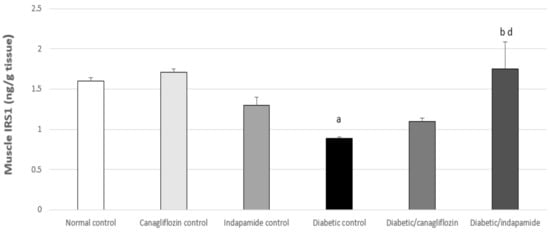 Impact of daily CANA and INDA treatment on soleus muscle IRS1 expression: oral CANA and INDA treatments were initiated once daily for 4 weeks. Data represent the mean ± S.E.M. (6 rats/group). ANOVA followed by post hoc Tukey–Kramer test at (p < 0.05) was used for statistical comparison; a against normal CTRL, b against diabetic CTRL, d against diabetic/CANA.