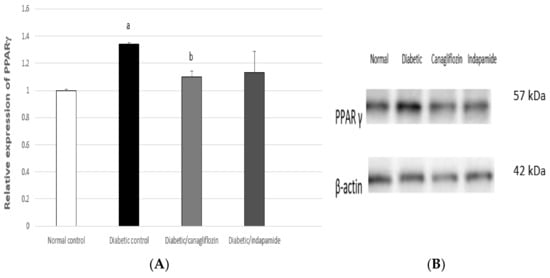 The diabetic CTRL demonstrated a significant increase of approximately 34% (p < 0.05) in PPARγ expression in epididymal adipose tissue compared to the normal CTRL. Oral CANA (10 mg/kg) treatment for 4 weeks caused a significant decrease of approximately 18% (p < 0.05) in PPARγ expression compared to the diabetic CTRL, while oral INDA (10 mg/kg) did not induce significant suppression in PPARγ expression compared to the diabetic CTRL, exhibiting no significant difference compared to the normal CTRL (Figure 12).