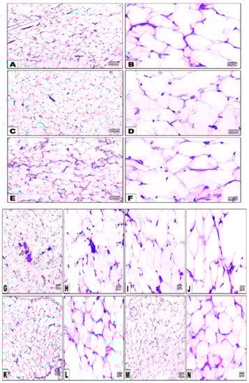 The histopathological examination of the normal (Figure 13A,B), CANA (Figure 13C,D) and INDA (Figure 13E,F) CTRLs confirmed the normal shape and size of the adipocytes. The diabetic CTRL specimen (Figure 13G–J) exhibited a significant decline by approximately 36% (Figure 13 p < 0.05) in the perimeter of the epididymal adipocytes compared to the normal CTRL. Both CANA (10 mg/kg) (Figure 13K,L) and INDA (10 mg/kg) (Figure 13M,N) significantly enhanced the perimeter of the epididymal adipocytes, which exhibited a significant approximately 1.4-fold (p < 0.05) increase compared to the diabetic CTRL (Figure 13).