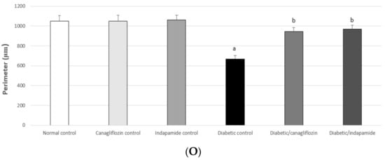 Adipose tissue specimens: normal (A,B), CANA (C,D), and INDA (E,F) CTRLs revealing the normal shape and size of the epididymal adipocytes; diabetic CTRL (G–J) showing congestion (arrow), decreased size of adipocytes, and macrophage infiltration (arrow heads). Marked increase in the size of the adipocytes in CANA (K,L) and INDA (M,N) treatment groups. Low magnification: 100× bar 100; high magnification: 400× bar 25. (O) Impact of daily treatment with CANA and INDA on epididymal adipocyte perimeter: oral CANA and INDA treatments were initiated once daily for 4 weeks. Data represent the mean ± S.E.M. (6 rats/group). ANOVA followed by post hoc Tukey–Kramer test at (p < 0.05) was used for statistical comparison; a against normal CTRL, b against diabetic CTRL.