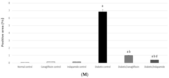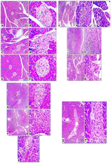 Figure 14 presents sections from pancreatic specimens with normal structure of both the exocrine acini and the islets of Langerhans (IL); α- and β-cells in normal (Figure 14A,B), CANA (Figure 14C,D) and INDA (Figure 14E,F) CTRLs. The diabetic CTRL (Figure 14G–M) specimens exhibited significant loss of basophilia in the exocrine acini, and retraction in the size of the islets with vacuolation of the α- and β-cells. In the CANA-treated group (Figure 14N–R), restoration of α- and β-cells was revealed, along with congestion and focal injury of the exocrine acini with infiltration with few perivascular mononuclear cells. In the INDA-treated group (Figure 14S,T) revealed mildly vacuolated β-cells with mild congestion and normal exocrine acini.