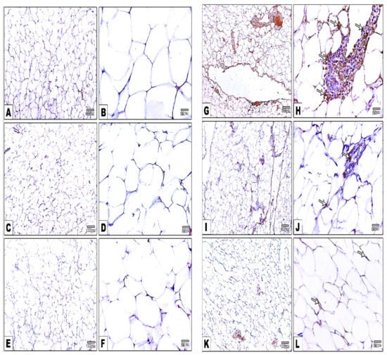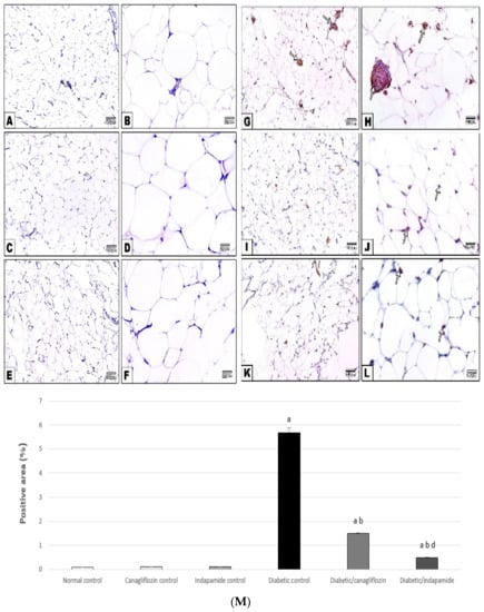 Immuno-stained adipose specimen against CD68 revealing negative immuno-staining in the normal (A,B), CANA (C,D), INDA (E,F) CTRLs. Increased positive immuno-staining of CD68-labeled macrophages (arrows) in the diabetic CTRL (G,H), and marked retraction in the CANA (I,J) and INDA (K,L) treatment groups. IHC counterstained with Mayer’s hematoxylin. Low magnification: 100× bar 100; high magnification: 400× bar 25. (M) Impact of daily treatment with CANA and INDA on CD68 expression in epididymal adipose tissue: oral CANA and INDA treatments were initiated once daily for 4 weeks. Data represent the mean ± S.E.M. (6 rats/group). ANOVA followed by post hoc Tukey–Kramer test at (p < 0.05) was used for statistical comparison; a against normal CTRL, b against diabetic CTRL, d against diabetic/CANA.