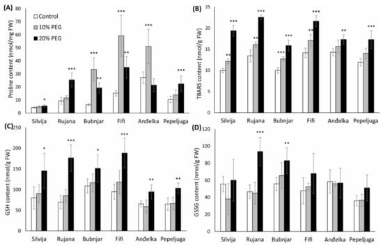 Content of (A) thiobarbituric reactive substances (TBARS); (B) proline; (C) reduced glutathione (GSH); and (D) oxidized glutathione (GSSG) in wheat seedlings of six Croatian wheat varieties (Silvija, Rujana, Bubnjar, Fifi, Anđelka, and Pepeljuga) under 10 and 20% PEG treatment. Expression data are presented as means of three independent biological replicates, and the error bars indicate standard deviations. Differences among treatments in each variety separately were assessed by a one-way analysis of variance (ANOVA), followed by the Dunnett post hoc test. The Dunnett test was performed at a significance level of 5, 1 and 0.1% (* p < 0.05, ** p < 0.01, *** p < 0.001).