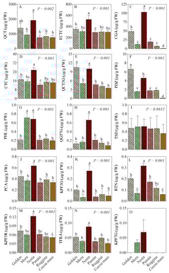Mean values and standard deviation for the concentration (μg/g DW) of (A) quercetin (QCT), (B) (−)-epicatechin (ECTC), (C) chlorogenic acid (CGA), (D) quercetin 3-O-glucoside (QCT3G), (E) phloridzin (PDZ), (F) (+)-catechin (CTC), (G) rutin (RTN), (H) phloretin (PHL), (I) kaempferol 3-O-glucoside (KPF3G), (J) tiliroside (TSD), (K) quercetagetin 7-O-glucoside (QGT7G), (L) p-coumaric acid (PCA), (M) kaempferol 7-O-glucoside (KPF7G), (N) trans-ferulic acid (TFRA), and (O) kaempferol 3-O-rutinoside (KPF3R), determined by UHPLC-ESI-MS/MS for dry apples. Data (n = 3) were analyzed by one-way ANOVA. Different letters are significantly different according to Tukey’s post-hoc test at the 0.05 probability level.