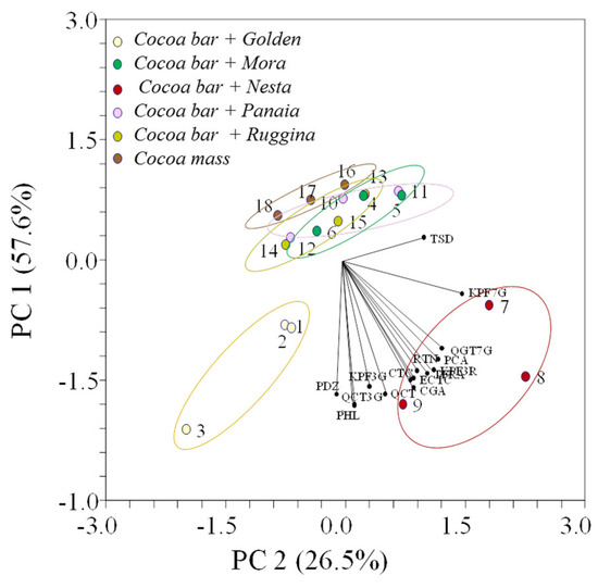 A principal component analysis was carried out with the aim of highlighting the relationship among selected variables and cocoa bars with dried apples and cocoa mass (Figure 3). Using the 15 polyphenols, the two principal components explain 84.11% of total variance, and allow a good differentiation among cocoa bars and cocoa mass.