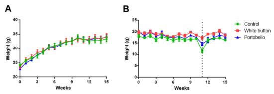 We also showed that supplementing a healthy diet with up to 5% of Agaricus mushrooms does not have an effect on mouse weight, even after 15 weeks. A previous study showed that A. bisporus can reduce obesity and accumulation of fat in the liver when experimental animals are exposed to a high-fat diet [29]. Therefore, the combination of a healthy diet and the intake of Agaricus mushrooms seems to be a good habit.