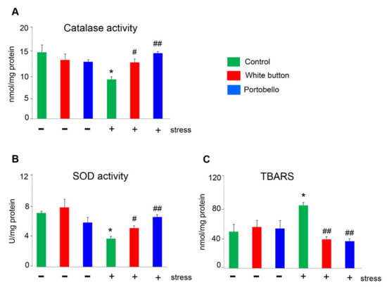 Furthermore, restraint stress precipitates many neurochemical, hormonal, and behavioral abnormalities that are associated with an imbalance of the brain’s intracellular redox state. Many authors have shown that restraint stress enhances lipid peroxidation and decreases the antioxidant enzyme activities in rodent brains [17,60]. SOD and catalase are the best-known antioxidant enzymes in the brain [65], and we found that the Agaricus-supplemented diets significantly increased the stress-reduced enzymatic activity of both proteins to levels undistinguishable from the non-stressed animals. On the other hand, lipid peroxidation is one of the main consequences of excessive brain ROS levels. MDA is one of the end products of such an activity and is commonly used as a marker of oxidative stress [66]. In this line, we found a significant increase of MDA in the brains of stressed mice that was prevented by the diets. All these data demonstrate the strong protective effect of the Agaricus-supplemented diets on brain stress and point to their beneficial effect on the diet.