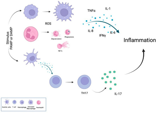 General mechanisms of inflammation. Innate immune cells (macrophages, dendritic cells, and neutrophils) stimulated by PAMPs or DAMPs, leading to their activation. Neutrophils display different mechanisms for eliminating pathogens. Dendritic cells are also involved in the differentiation of T cells to the TH17 phenotype. All these cells secrete different proinflammatory cytokines that promote the inflammatory process created with Bioreder.com (accessed on 28 March 2022).