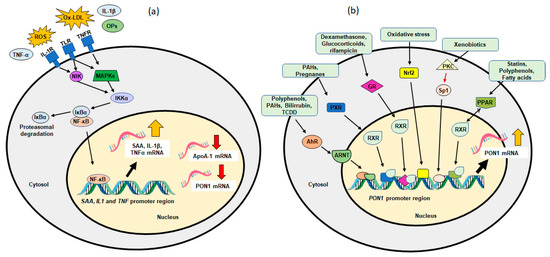 Mechanisms of the transcriptional regulation of PON1. (a) Regulation by cytokines—the mechanism is still unclear. (b) Regulation through nuclear factors activated by endogenous and exogenous factors.