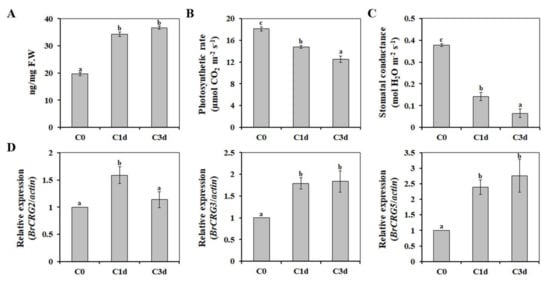 Physiological response to cold stress in heading type Kimchi cabbage. The changes in levels of proline (A), photosynthetic rate (B), stomatal conductance (C), and selected gene expression (D) after cold treatment were determined. The data are presented as mean ± SE. Values with different letters are significantly different, according to Duncan’s multiple range test. C0, plants grown at 20 °C (control plants); C1d and C3d, plants subjected to cold stress (10 °C) for 1 day and 3 days, respectively.