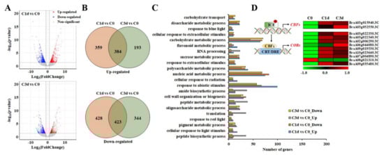 Transcriptome sequencing has proven to be a highly efficient strategy to unravel the global expression network in adversity stress in many species, such as B. rapa [19] and B. rapus [26,27]. To investigate an overview of the molecular mechanisms associated with the cold-stress response in HtKc, we generated transcriptome libraries using total RNA obtained from the leaves of control and cold-stressed HtKc, and transcriptome libraries were deposited in the National Agricultural Biotechnology Information Center (http://nabic.rda.go.kr, accessed on 28 February 2022, Table S2). After removing the low-quality reads, 33–35 million clear reads (3.16 to 3.34 Gb) were obtained from three libraries, and >90% of the clean reads could be mapped on the reference genome (Table S2). To identify the cold-induced DEGs, we constructed two comparison groups (C1d vs. C0 and C3d vs. C0), and the DEGs were determined based on the cutoff used (p-value ≤ 0.01 and |log2 (fold change)| ≥ 1), as indicated on a Volcano plot (Figure 2A). A total of 1594 DEGs, including 743 up-regulated and 851 down-regulated genes, were detected between C0 and C1d libraries (Figure 2B). Comparative analysis of C0 and C3d libraries exhibited that 577 genes were up-regulated, and 767 genes were down-regulated in C3d. Among them, 384 up-regulated and 423 down-regulated genes were commonly detected in cold-stressed HtKc. To understand the biological function of DEGs, GO enrichment analysis was carried out. Various functional groups were identified, and a large proportion of the DEGs were found involved in the “carbohydrate metabolic process”, “response to abiotic stimulus”, and “nucleic acid metabolic process” (Figure 2C), indicating that the cold stress affected various metabolic processes. Similar to our findings, the GO term “response to abiotic stimulus” has been highlighted by various transcriptomic studies related to cold stress in other plants [28,29,30]. To date, a significant number of cold-response genes have been identified in numerous crops. Among them, the inducer of CBF expression (ICE)-C-repeat binding factor (CBF)-cold-responsive (COR) pathway is one of the most commonly reported pathways [31]. CBF genes, activated by ICE, up-regulate COR genes to enhance plant cold tolerance [31]. In HtKc, the transcript abundance of genes involved in the ICE-CBF-COR cascade dynamically changed in response to cold stress (Figure 2D), and the results revealed a transcriptional regulatory network with candidate genes involved in the cold tolerance in HtKc.